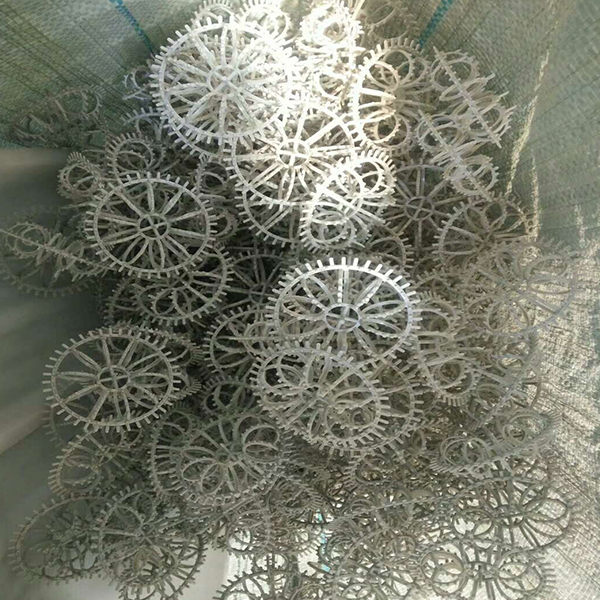 pp規整填料是(shì)在(zài)軟性填料和半軟(ruǎn)性填(tián)料的基礎(chǔ)上發展而(ér)成的,它兼有兩者的優點。其結構是將塑(sù)料圓片壓扣改成雙圈大塑料環,將醛化(huà)纖維或(huò)滌綸絲壓在環的(de)環圈(quān)上,使纖維束均勻分布(bù);內圈(quān)是雪花狀塑料枝條,既能掛膜,又能有效切割氣泡,提高氧的轉移速率和(hé)利用率。使水氣生物膜得到(dào)充分交換,使水中的有機物得到(dào)高效(xiào)處理。無毒、無味,密度小,強度、剛度、硬度耐熱性均優於低壓聚乙烯,可在100℃左右使用。